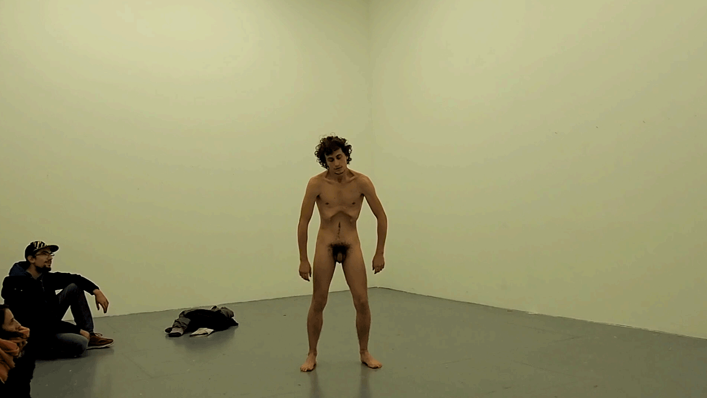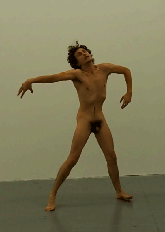 Dans un espace blanc, un individu nu interprète une danse macabre et trouve de l'étrange dans un corps en bonne santé.