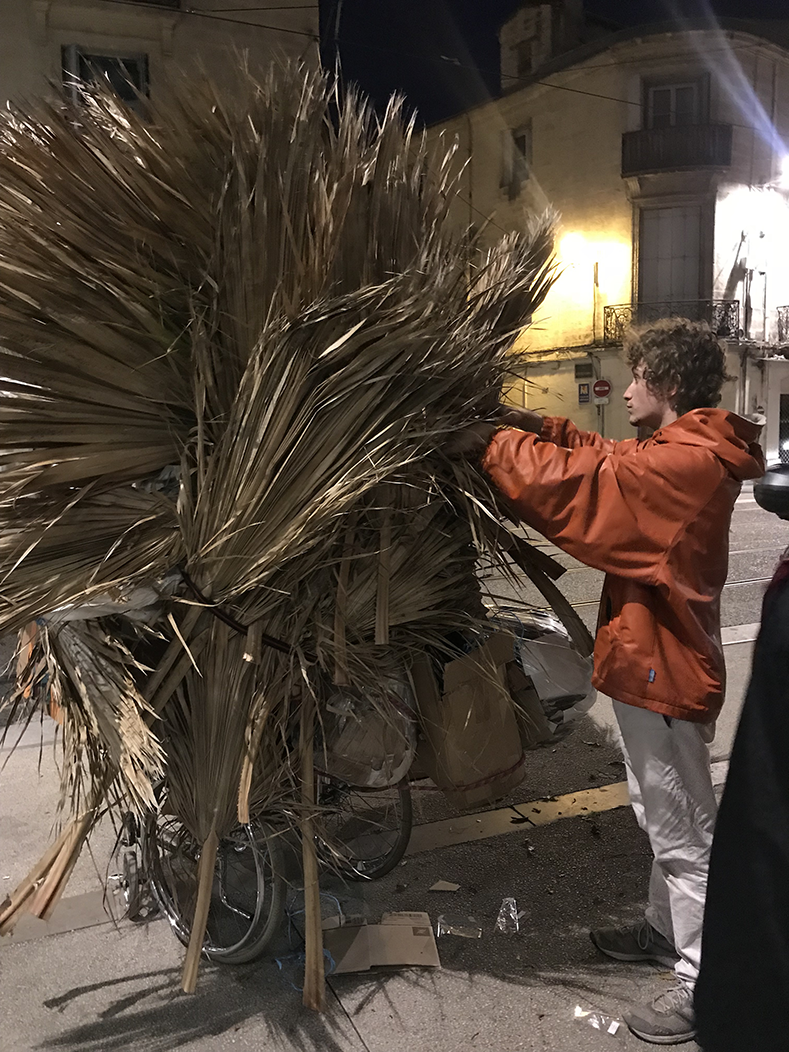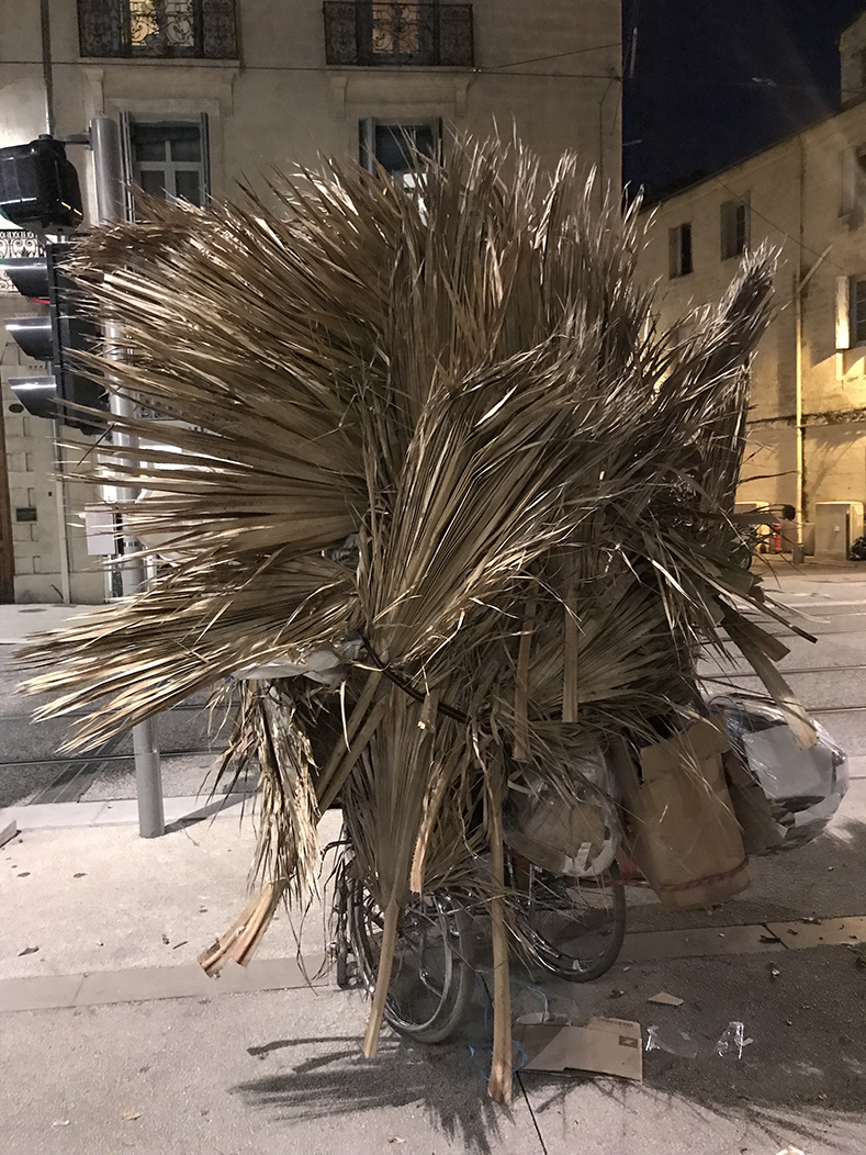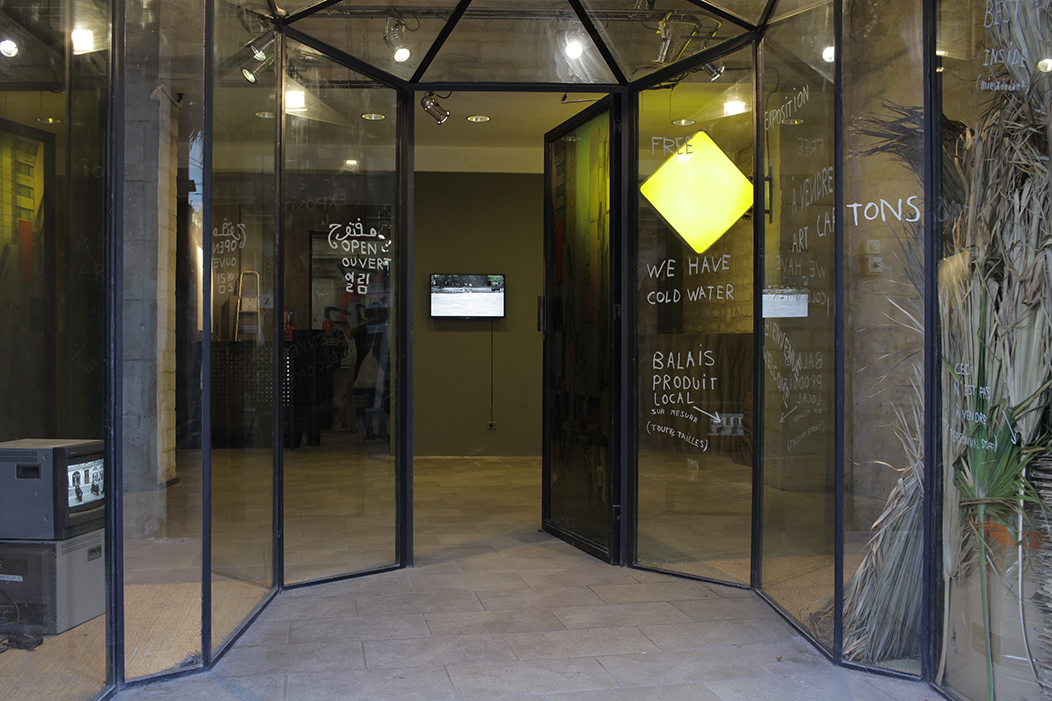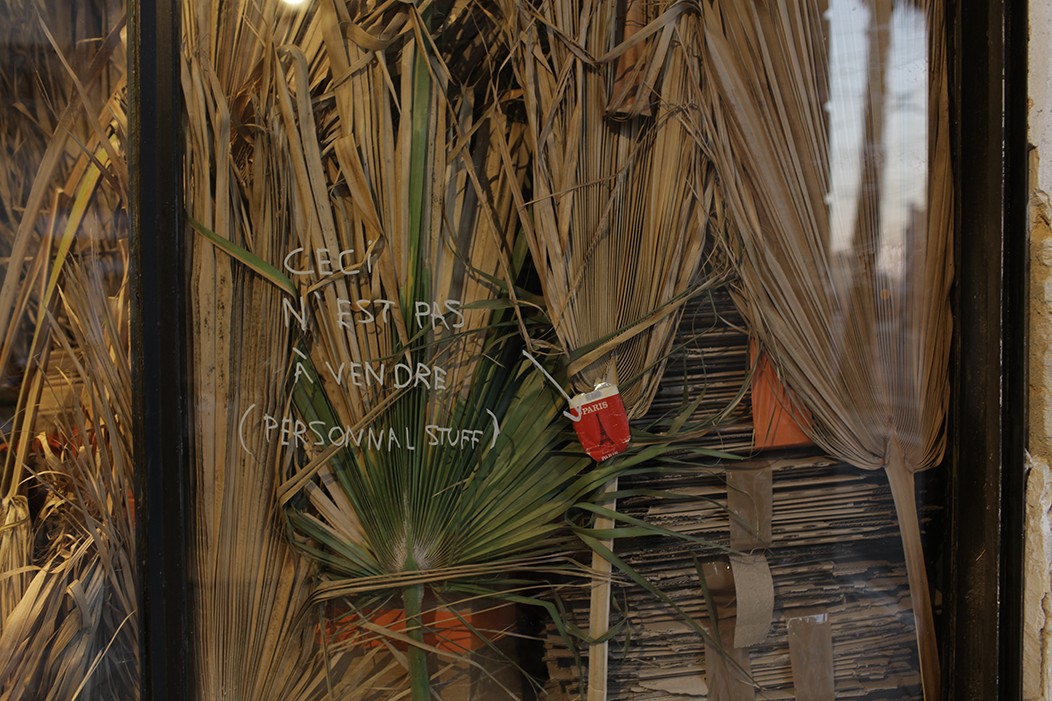 Chaque fin de journée, un homme ramasse dans la rue des cartons avec un fauteuil roulant transformé en chariot, il stocke les cartons derrière la vitrine de la galerie d'exposition et écrit sur ces vitres les chemins qu'il emprunte et quelques annonces, il dort sur place.
