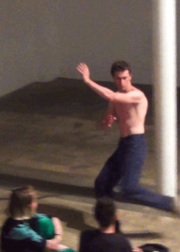 Un homme fait une démonstration de kung fu et utilise l'environnement architectural et humain qui l'entoure pour le faire.