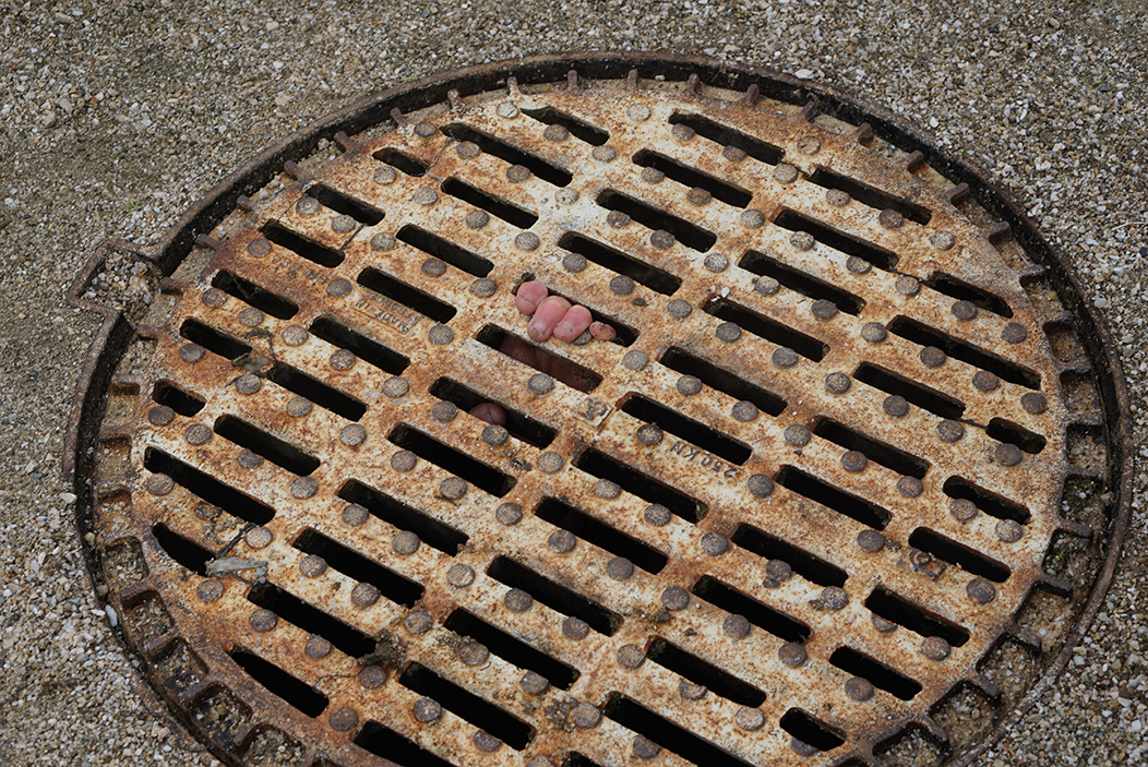 Sous une grille d'évacuation des eaux de pluie, un homme danse sur de la musique hardcore.